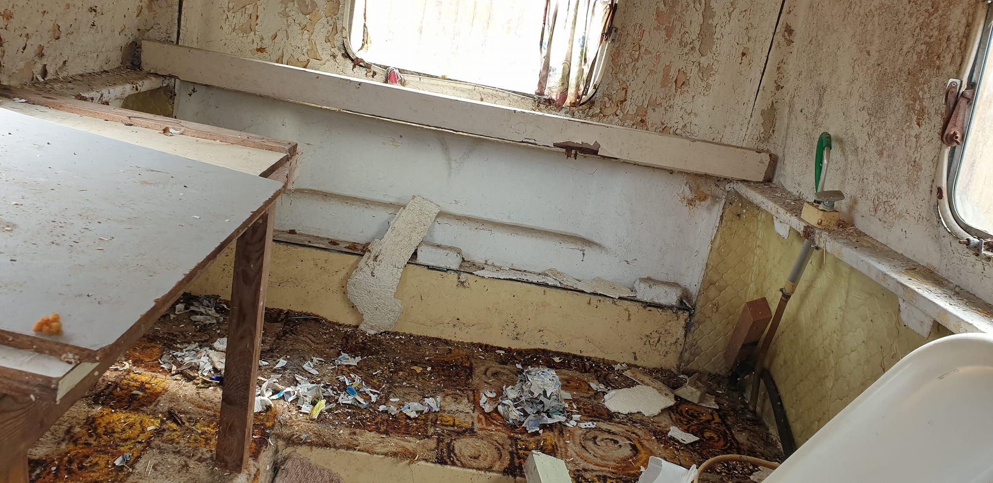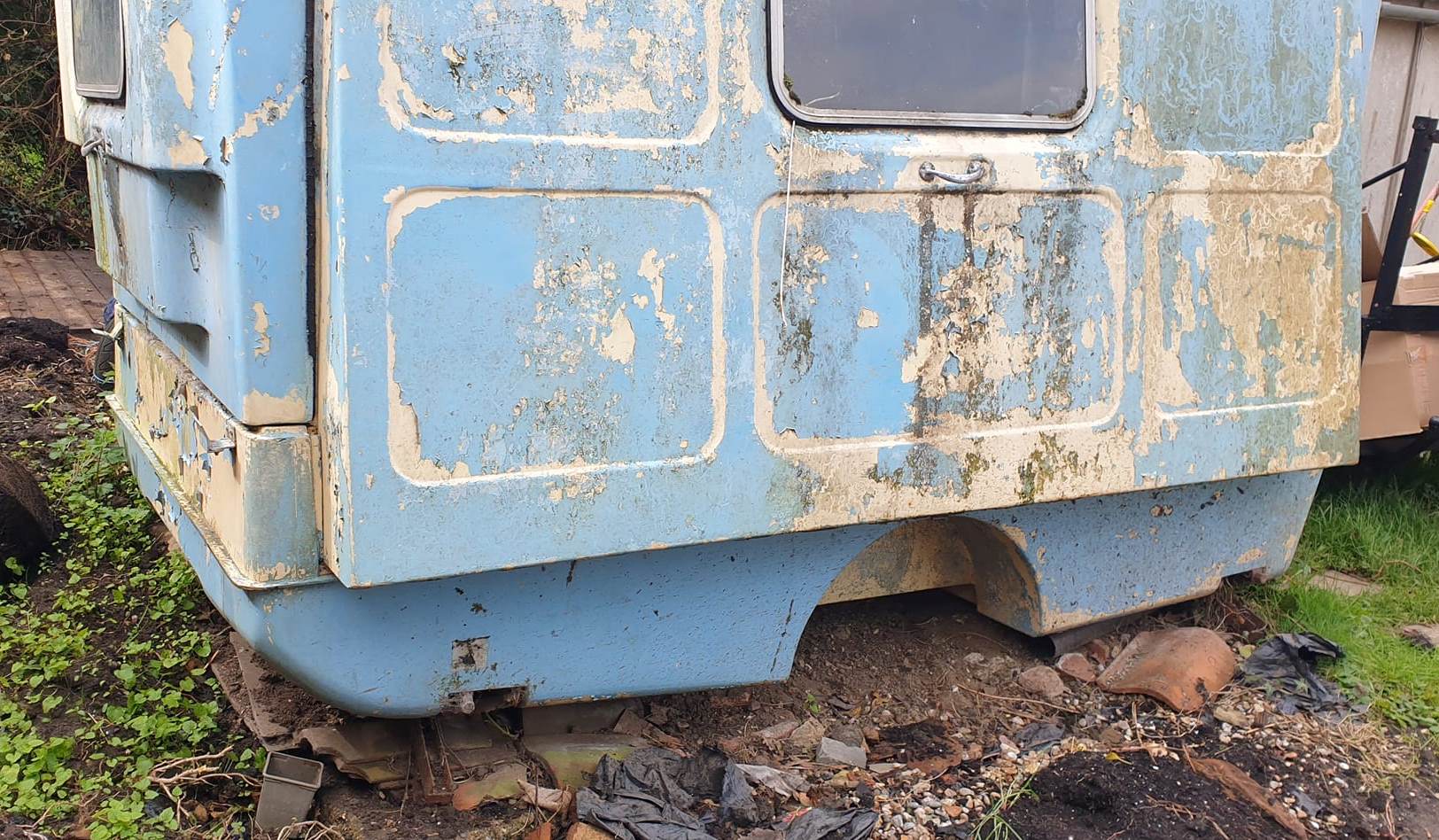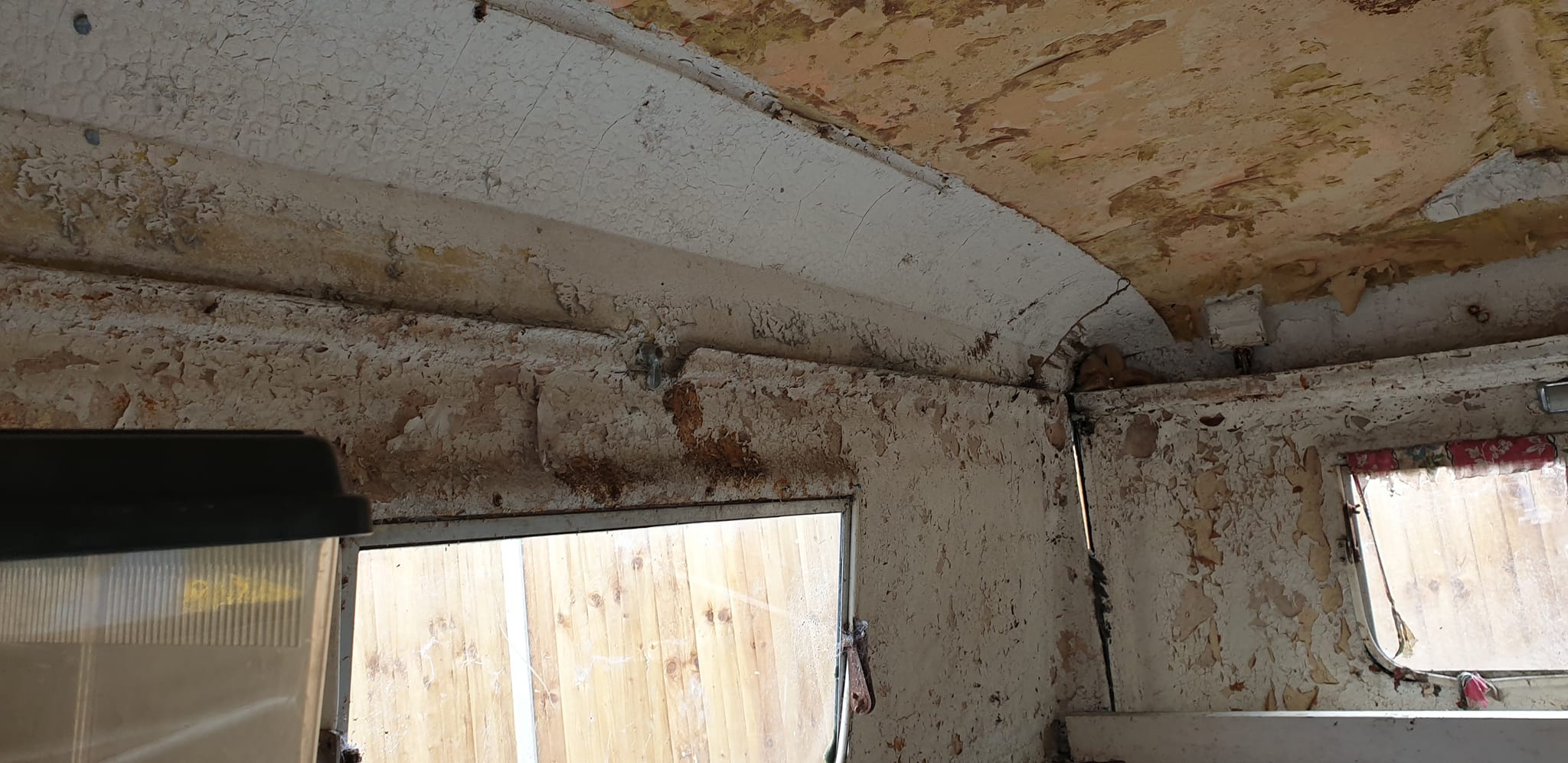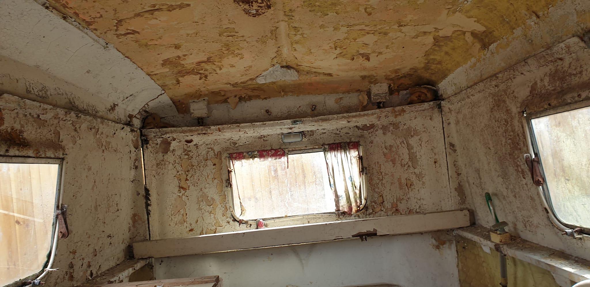 It is in bad condition. I am in no dream world about that, the inside polystyrene stuff has peeled off, but the roof seems in one piece that i can see, the floor is now giving way in the middle - but maybe something can be done, the windows (two side ones I can see are intact - (when hedge has died back will see the back one) I believe the side panels are ok, but there is no chassis, (we really have to keep the chassis as it is now a trailer that we use!). I can't see all of the inside at the moment as it's being used for storage, and now aware on the joints its not 100% water tight no more. (it's been erected for over 27 years)